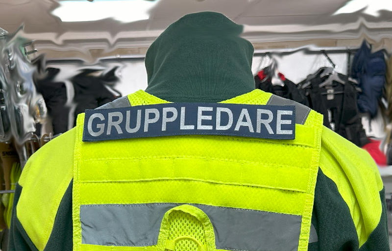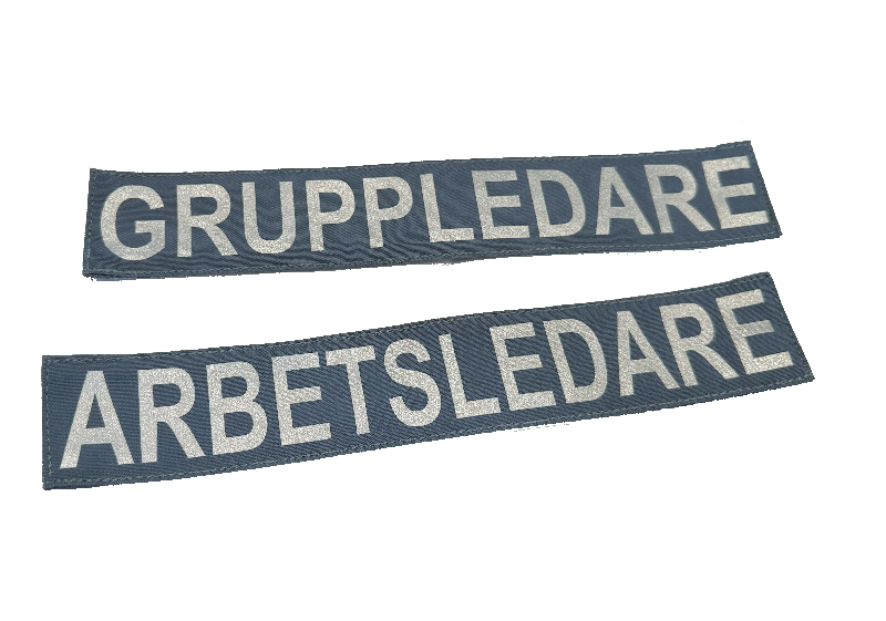 Gruppledare tryckt i reflex på blå botten (enligt RPS föreskrifterna). Levereras med kardborre baksida.