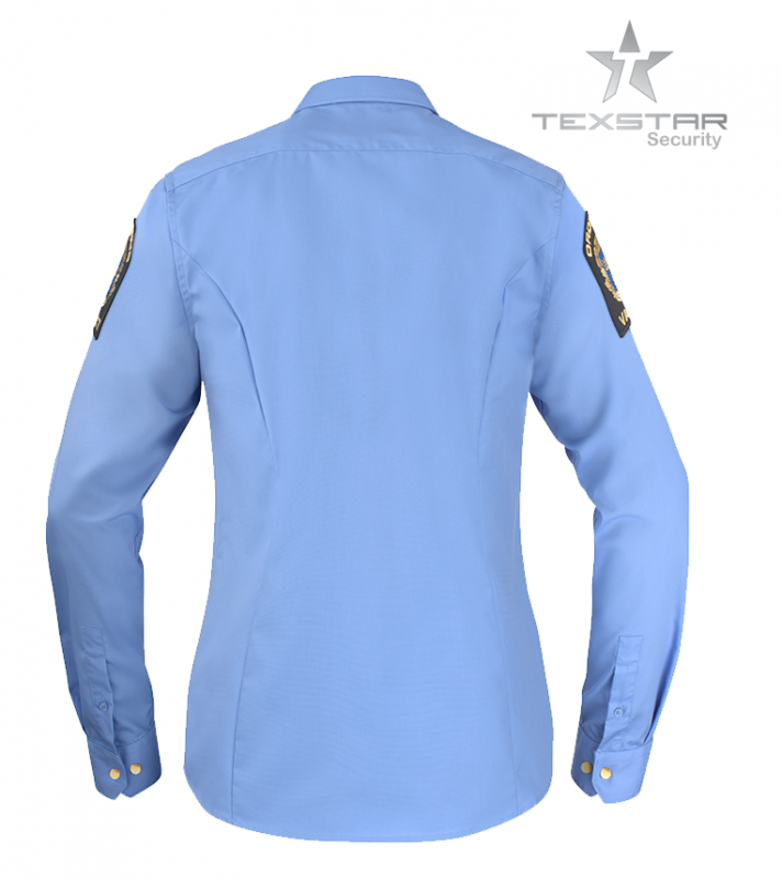 Klassisk skjorta med modern krage, lång ärm och två bröstfickor med guld knapp. Vänster bröstficka har öppning för penna. Monofonhållare på höger och vänster axel och namnhållare höger bröst. Ordningsvaktsemblem på båda ärmar och med funktionsbeteckning vänster bröst. Guld knapp på manschetten. Finns i snyggt skuren dam- och herr modell. Den blå färgen är godkänd NCS 2142-R83B enligt Polisens FAP 670-1 (PMFS 2017_12).