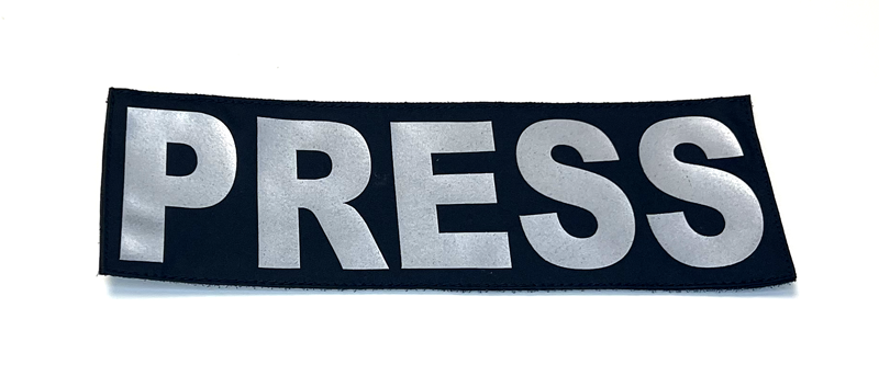 Reflex märke med texten press. Tryckt på en svart bakgrund och med hårdkardborre på baksidan. Avsett att bäras framtill eller på hjälmen.