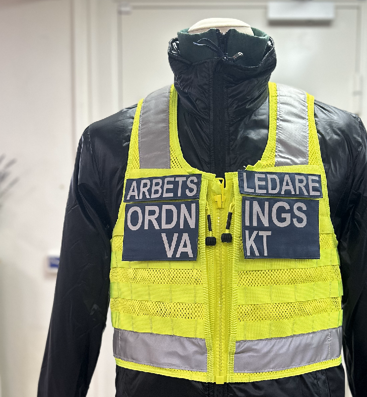 Arbetsledare tryckt i reflex på blå botten (enligt RPS föreskrifterna). Levereras med kardborre baksida.