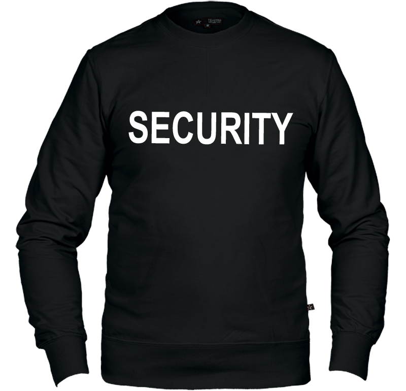 Sweatshirt med texten Security tryckt på ryggen i vit samt ett litet tryck på vänster bröst.