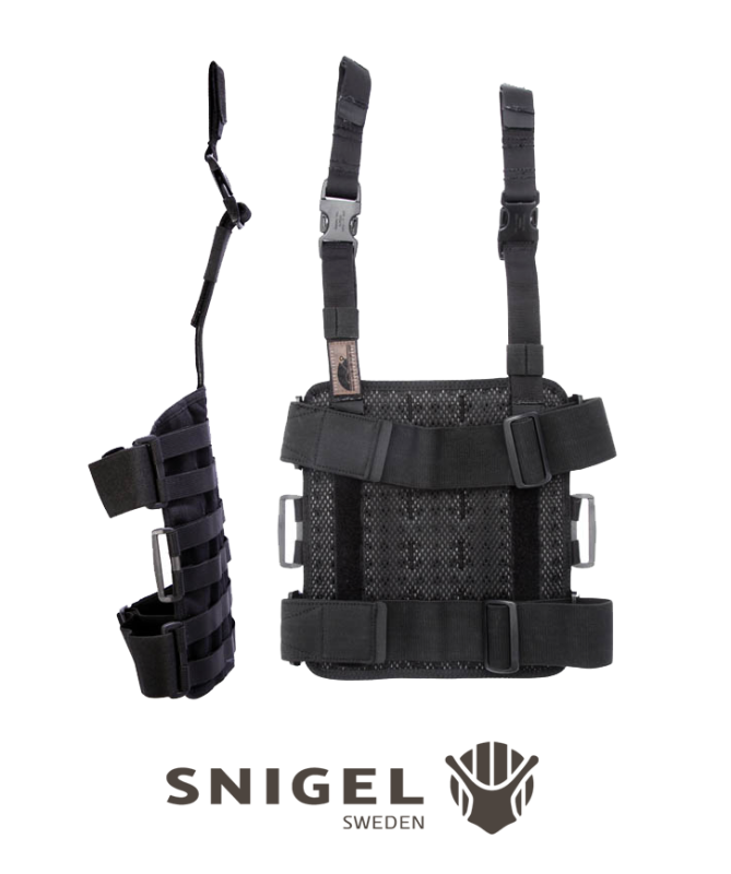 - Quick release buckle with pivot function attaches the leg plate to your belt.