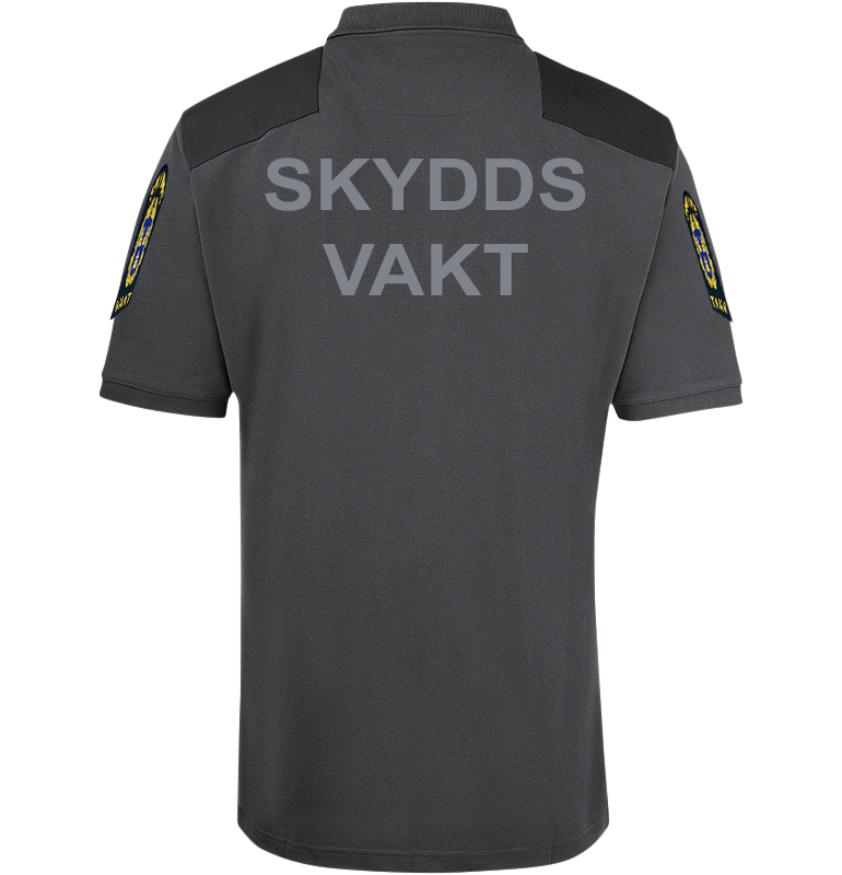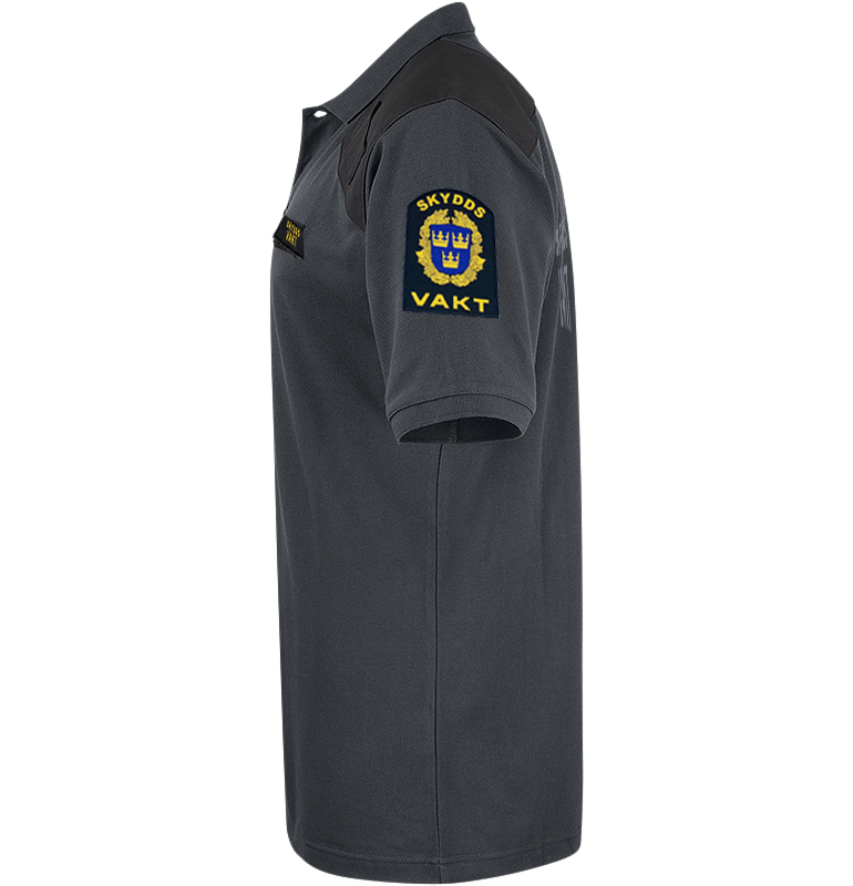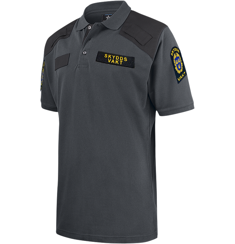 En modern piké med bra passform, snygg widespread-krage som håller formen. Förstärkt axelparti, monofonhållare på höger och vänster axel. Namnhållare höger bröst. Funktionsbeteckning skyddsvakt, vänster bröst som fästs med kardborre ingår – lätt att byta. Samt emblem på båda ärmarna och reflextryck på ryggen som tillval. kan beställas här.