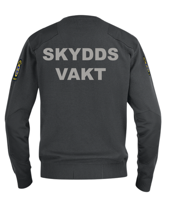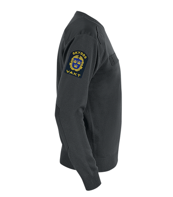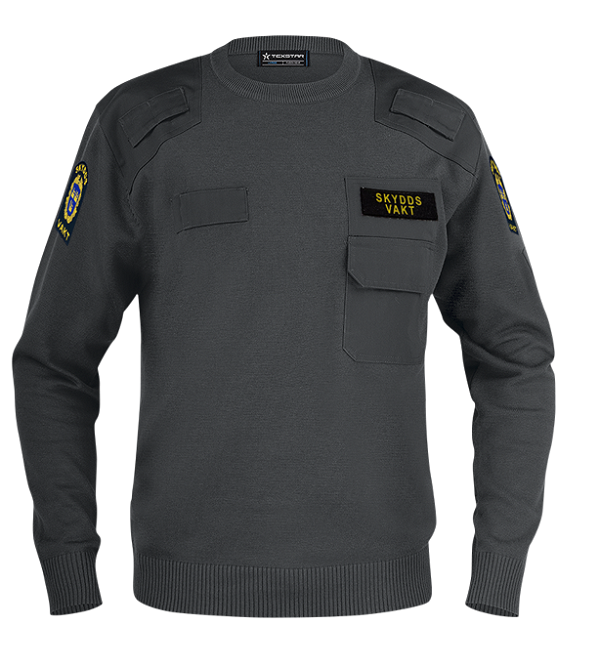 Härlig pullover med ribbstickad rund hals, ärmslut och nederkant. Bröstficka med lock och pennficka på vänster arm. Axelparti och armbågar är förstärkta. Monofonhållare på höger och vänster axel. Namnhållare höger bröst. Funktionsbeteckningar Skyddsvakt som fästs med kardborre ingår – lätt att byta.