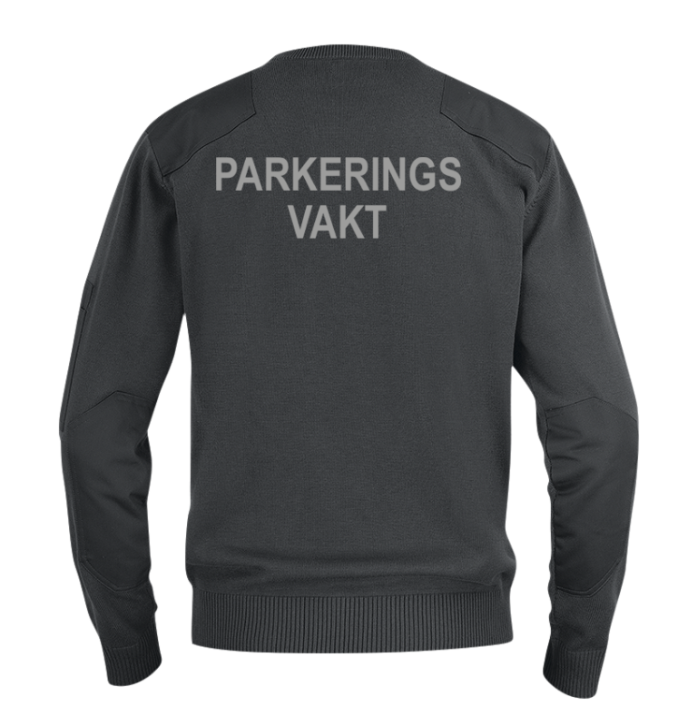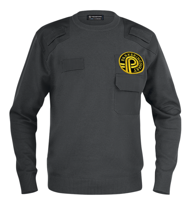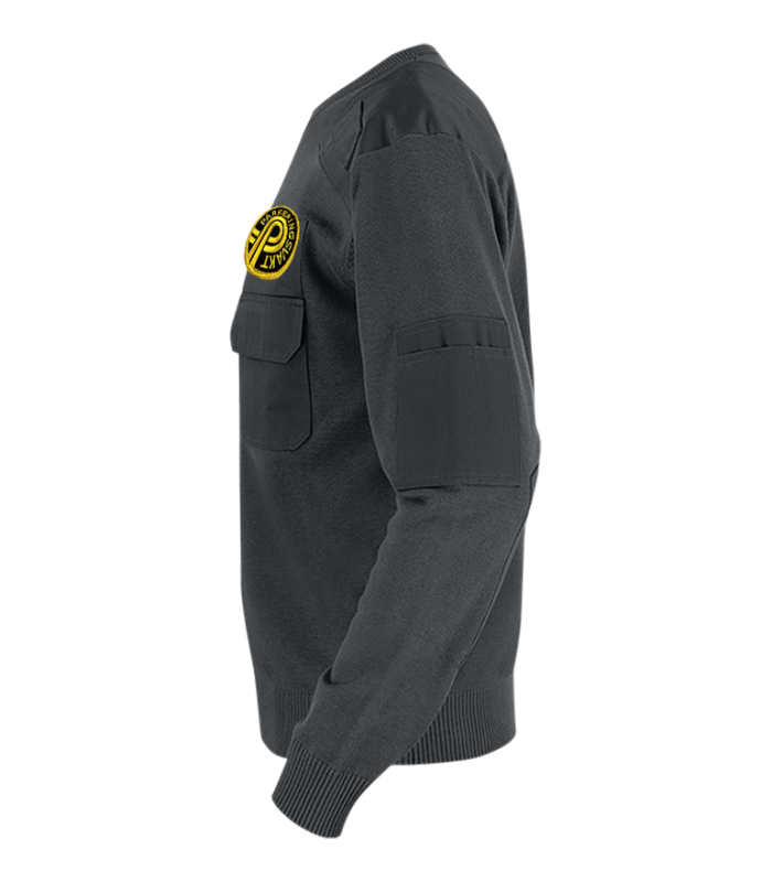 Härlig pullover med ribbstickad rund hals, ärmslut och nederkant. Bröstficka med lock och pennficka på vänster arm. Axelparti och armbågar är förstärkta. Monofonhållare på höger och vänster axel. Namnhållare höger bröst. Funktionsbeteckning kan fästas med kardborre på vänster bröst.