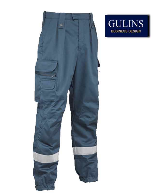 En hundförarbyxa i herr modell i slitstarkt material. Dubbla bälteshällor med tryckknapp. Benfickor med låsbara ficklock och kardborre samt flera extra fickor både med kardborre och dragkedja. En bakficka med ficklock och kardborre. Reflexband nertill på båda benen. Förstärkning på knän. Tryckknapp, resår och dragkedja i ben slut.