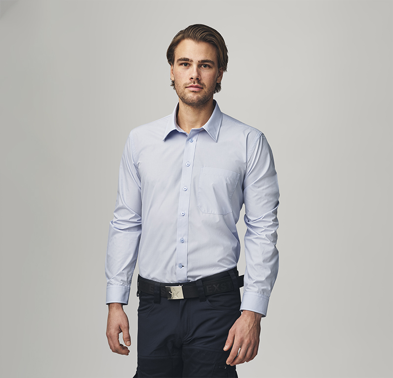 Figursydd skjorta med modern affärslook. Tål mer tack vare blandningen av polyester och bomull, vilket också gör den mycket lättskött. Vi gillar den rena designen och den klassiska kragen. Att den klarar 60° tvätt är inte heller någon nackdel.