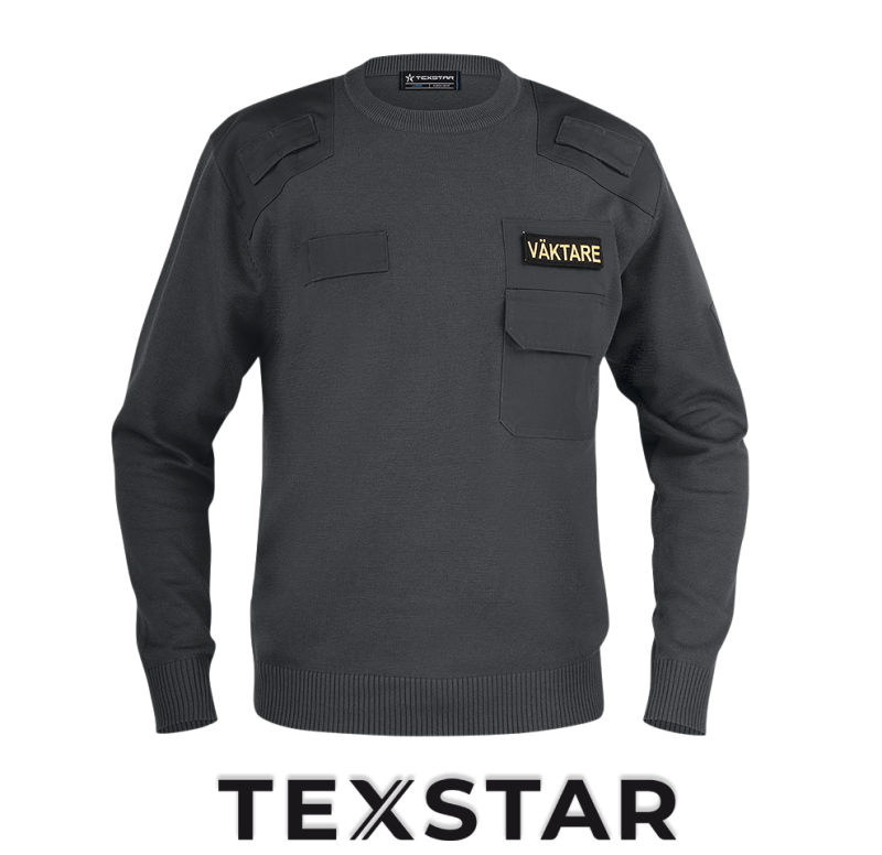 Härlig pullover med ribbstickad rund hals, ärmslut och nederkant. Bröstficka med lock och pennficka på vänster arm. Axelparti och armbågar är förstärkta. Monofonhållare på höger och vänster axel. Namnhållare höger bröst. Funktionsbeteckning Väktare, vänster bröst som fästs med kardborre ingår – lätt att byta.