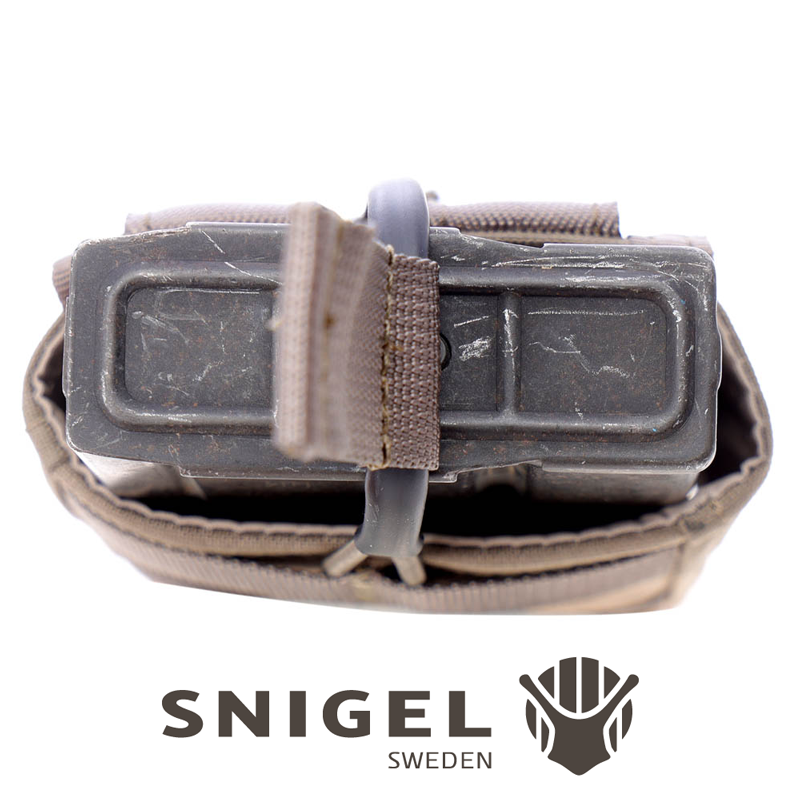 Magasinsfickan har en elastisk snörning i toppen som är snabb och lätt att öppna och har en låg skärning för att göra det snabbare att ta bort magasinet. Snörningen har även blivit uppdaterad med krympslang för bättre hållbarhet (se bild). 25 mm MOLLE band på utsidan gör att du kan fästa andra fickor på utsidan, två eller flera magasinsfickor kan fästas på varandra.